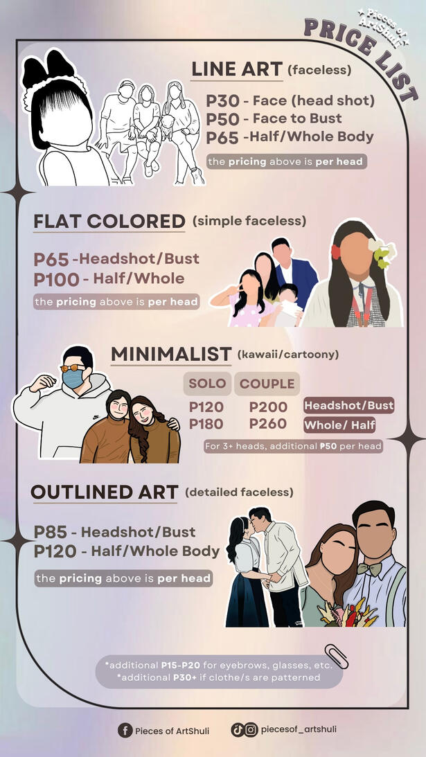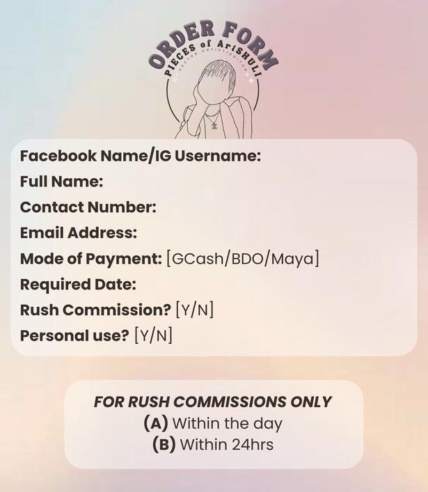 βοΈPayment first / 70% downpayment policy only!π Strictly NO REFUND once the artwork is startedπ Pay within 24hrs of transaction to secure your date slotπ MOP: GCash/Maya/Bank Transferπ₯ Soft copies will be sent via emailποΈ Additional fee for rush commissions (20%-35%)